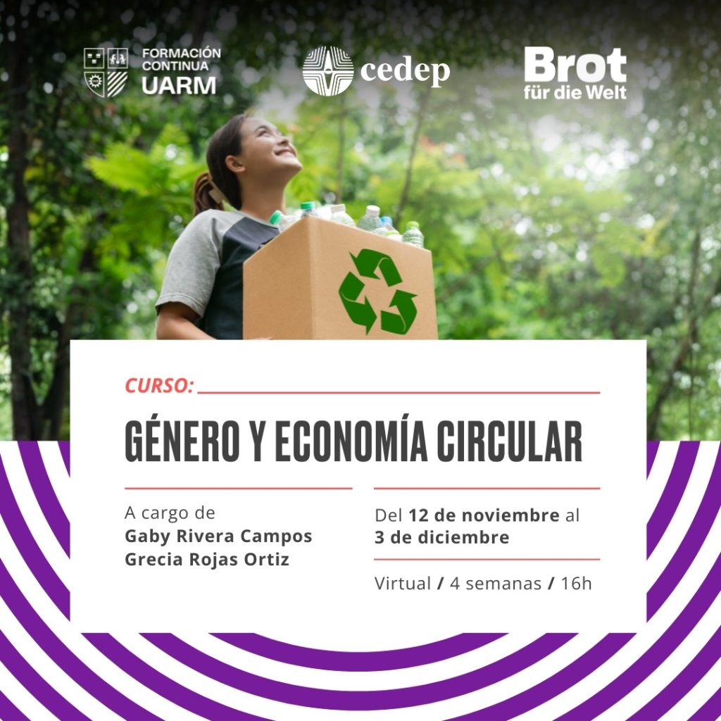 Hoy, miércoles 12 de noviembre, CEDEP inicia el curso “Género y Economía Circular”, una propuesta formativa desarrollada en alianza con la Universidad Antonio Ruiz de Montoya (UARM) y con el apoyo de Pan para el Mundo.